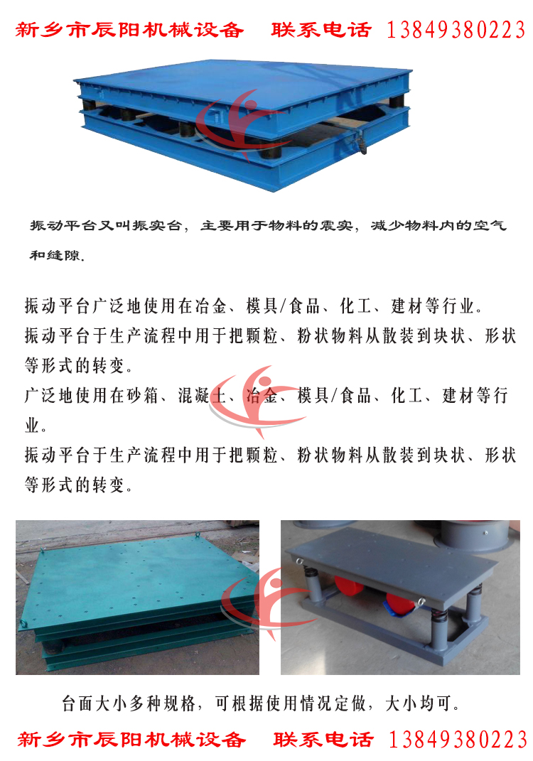 2、 振動平臺的振動機構(gòu)主要由若干臺振動電機、傳動板構(gòu)成,振動電機的數(shù)量一般為偶數(shù),如:4、6、8、10等,振動電機的型號決定了三維振動平臺的主要技術(shù)參數(shù)。