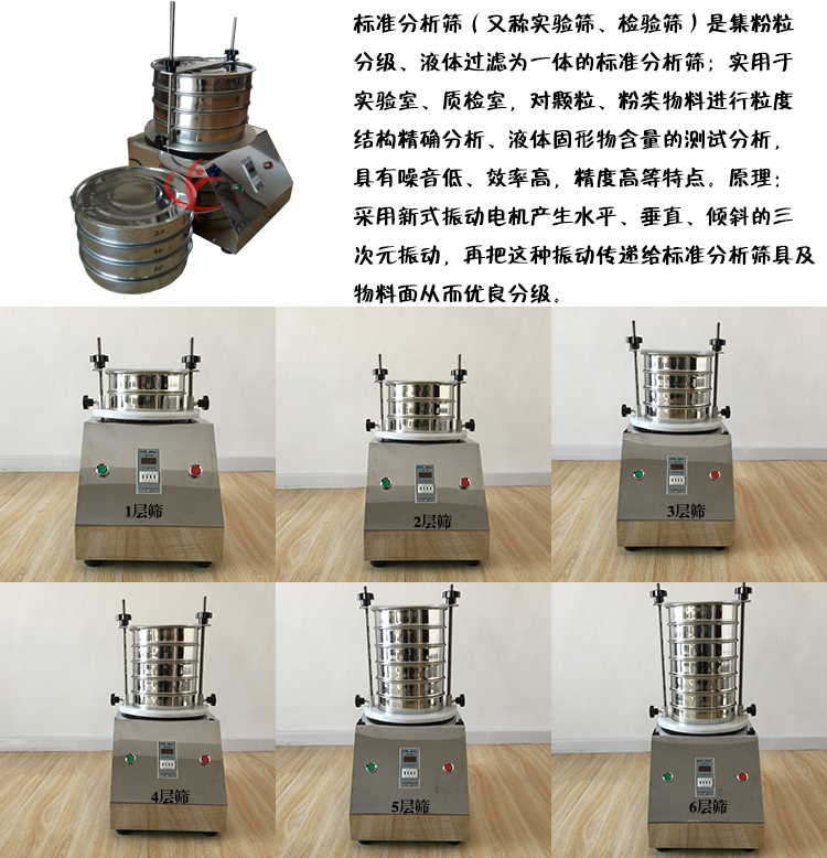 2、把標(biāo)準(zhǔn)篩具按孔徑從小到大,從下到上依次疊放到托盤座上,由凹槽或定位螺絲對標(biāo)準(zhǔn)篩進(jìn)行定位。