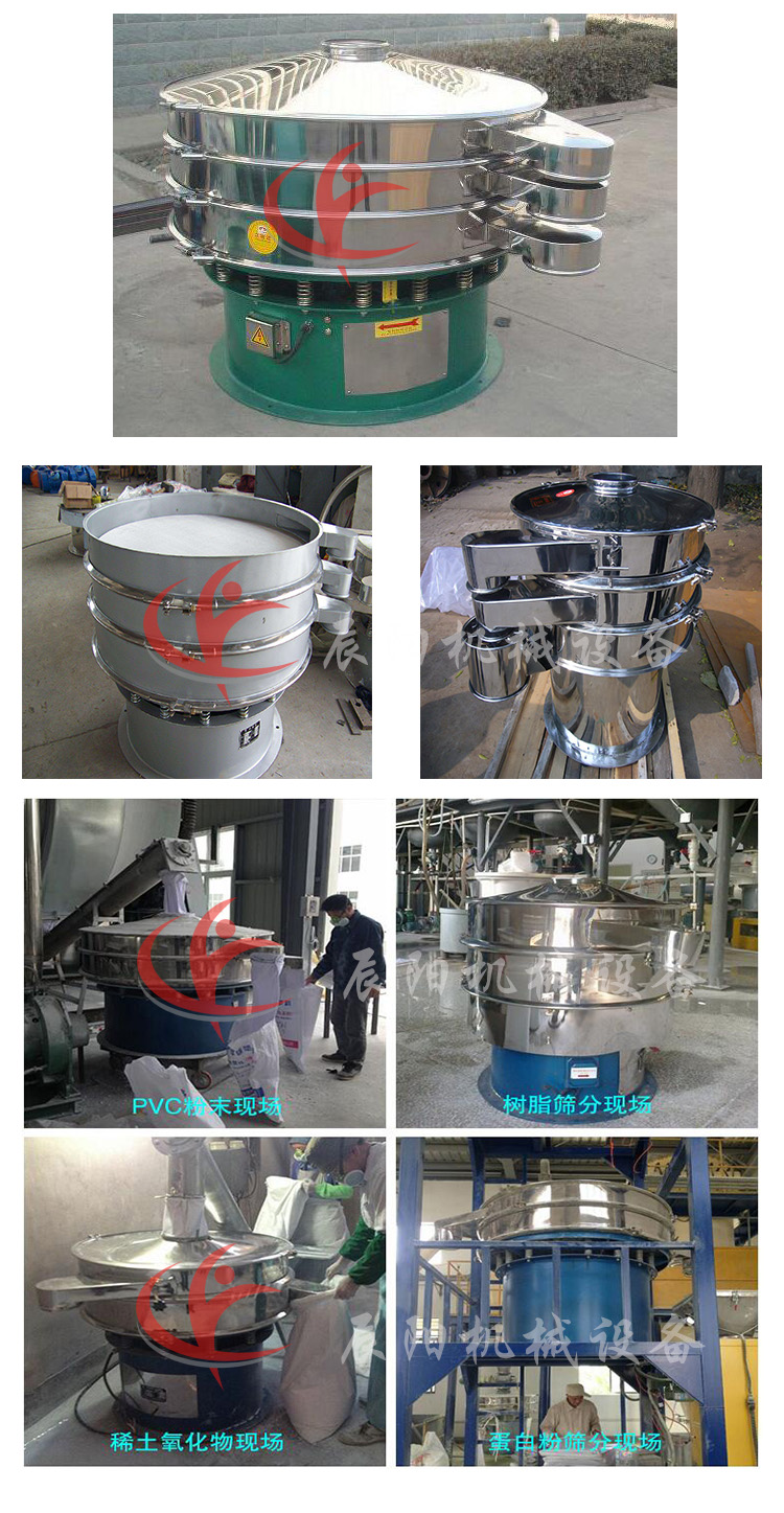 旋振篩由直立式振動(dòng)電機(jī)、普通電機(jī)拖動(dòng)激振器兩種振動(dòng)方式,振動(dòng)源上下兩端安裝有偏心重錘。下兩端重錘,配置不同,激振源在旋轉(zhuǎn)時(shí),產(chǎn)生水平、垂直、傾斜的三次元運(yùn)動(dòng),再把這個(gè)運(yùn)動(dòng)傳遞給篩面。調(diào)節(jié)上、下兩端的相位角,可以改變物料在篩面上的運(yùn)動(dòng)軌跡,達(dá)到精細(xì)篩分、除雜、過濾 的目的。